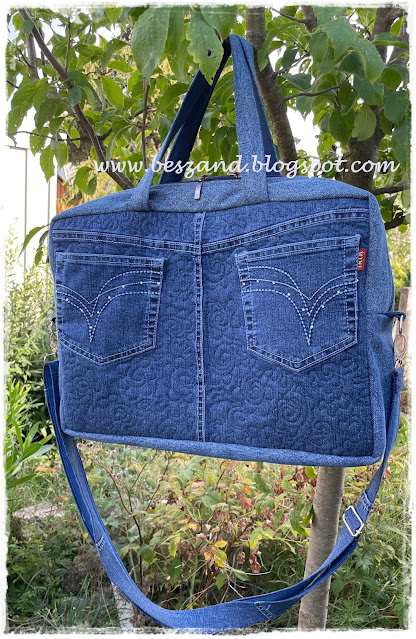 Egy szoknyából és két nadrágszárból szabtam. Az érdekessége , hogy a táska bélése a gyerekkori kedvenc takarója volt. Anyukája próbálta így az otthonra emlékeztetni a lányát. Nagyon aranyos gondolat, örültem neki én is.